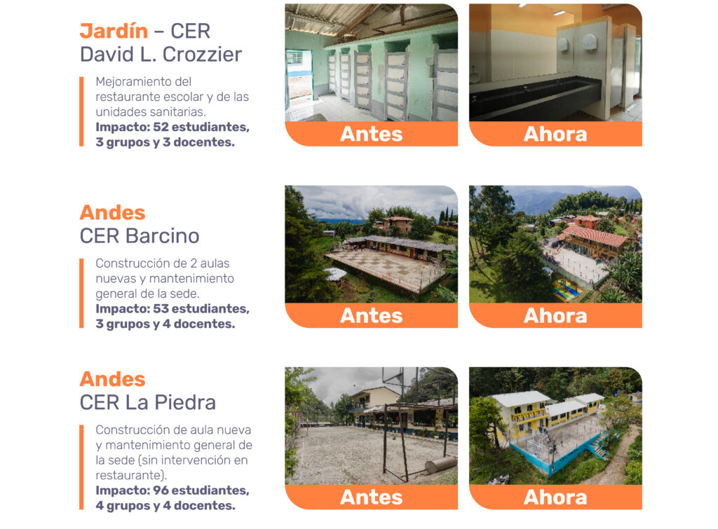 Nuestro negocio de Gestión del Hábitat continúa aportando al mejoramiento de la educación rural con intervenciones que dignifican los espacios de aprendizaje y fortalecen las comunidades. En el marco de la Alianza por la Infraestructura Educativa en Antioquia con la Fundación Fraternidad Medellín y la Gobernación de Antioquia en Jardín entregamos el CER David L. Crozzier y en Andes el CER Barcino y CER La Piedra.